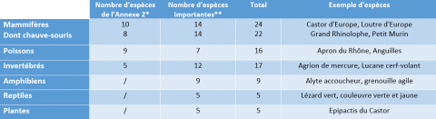 Sur le site Natura 2000 "Milieux alluviaux du Rhône aval", 58 espèces sont inscrites à la Directive Habitat Faune Flore en tant qu'espèce d'intérêt communautaire et 18 autres sont classées en espèces importantes à protéger.