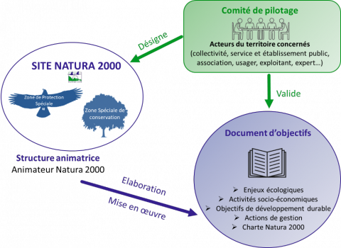 Afin que les partenaires s’approprient les enjeux du dispositif Natura 2000, et à travers ceux-ci les grands enjeux de la biodiversité et du développement durable, la réglementation française favorise la concertation : élus, agriculteurs, forestiers, chasseurs, pêcheurs, propriétaires terriens, associations, usagers et experts sont associés à la gestion de chaque site. La participation active de l’ensemble des acteurs locaux et le dialogue au sein des comités de pilotage (COPIL) des sites Natura 2000 permettent à chacun de s’approprier les enjeux de conservation du patrimoine naturel et les enjeux socio-économiques du territoire, de contribuer à la définition des objectifs et de construire une gestion de la nature fondée sur les connaissances des acteurs du territoire.